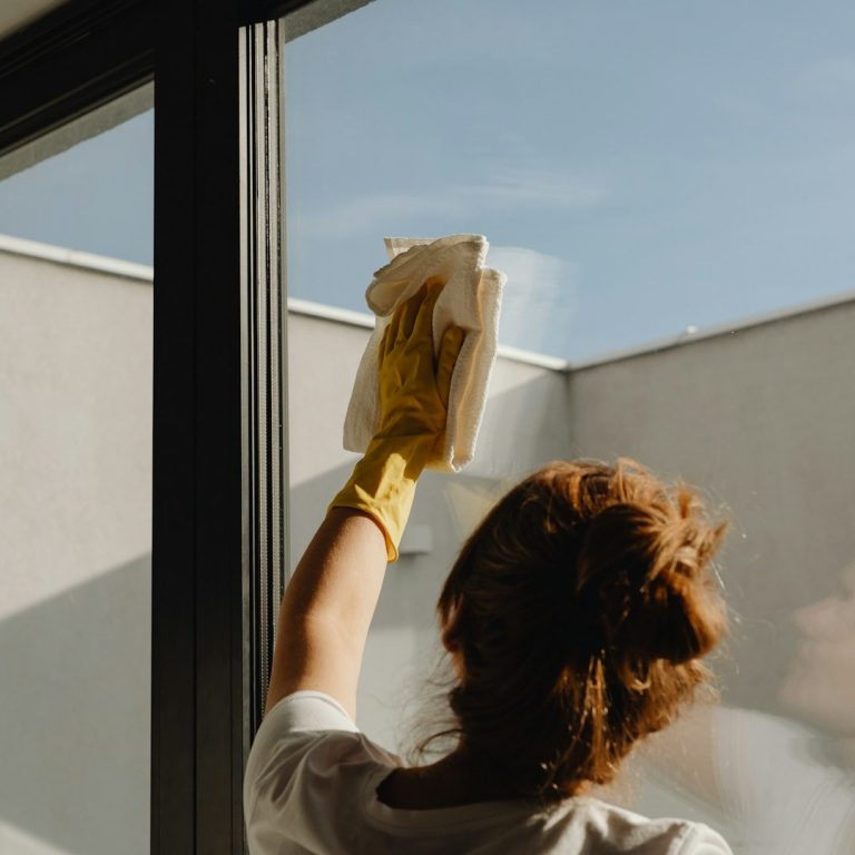 Reinigung von Fensterinnenseiten und -außenseiten, einschließlich Rahmen und Fensterbänken.